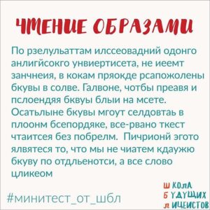ЧТЕНИЕ ОБРАЗАМИ Смогли прочитать? А смысл поняли? Удивительно, не правда ли? Оказывается, наш мозг читает не словами, а смыслами. И чем более развита у него эта способность, тем выше скорость чтения. А попробуйте ребёнку дать этот текст. Поймёт он прочитанное? Напишите, пожалуйста, в комментариях. Очень интересно. В марафоне — скорочтение — у нас будет много упражнений, направленных на то, чтобы…