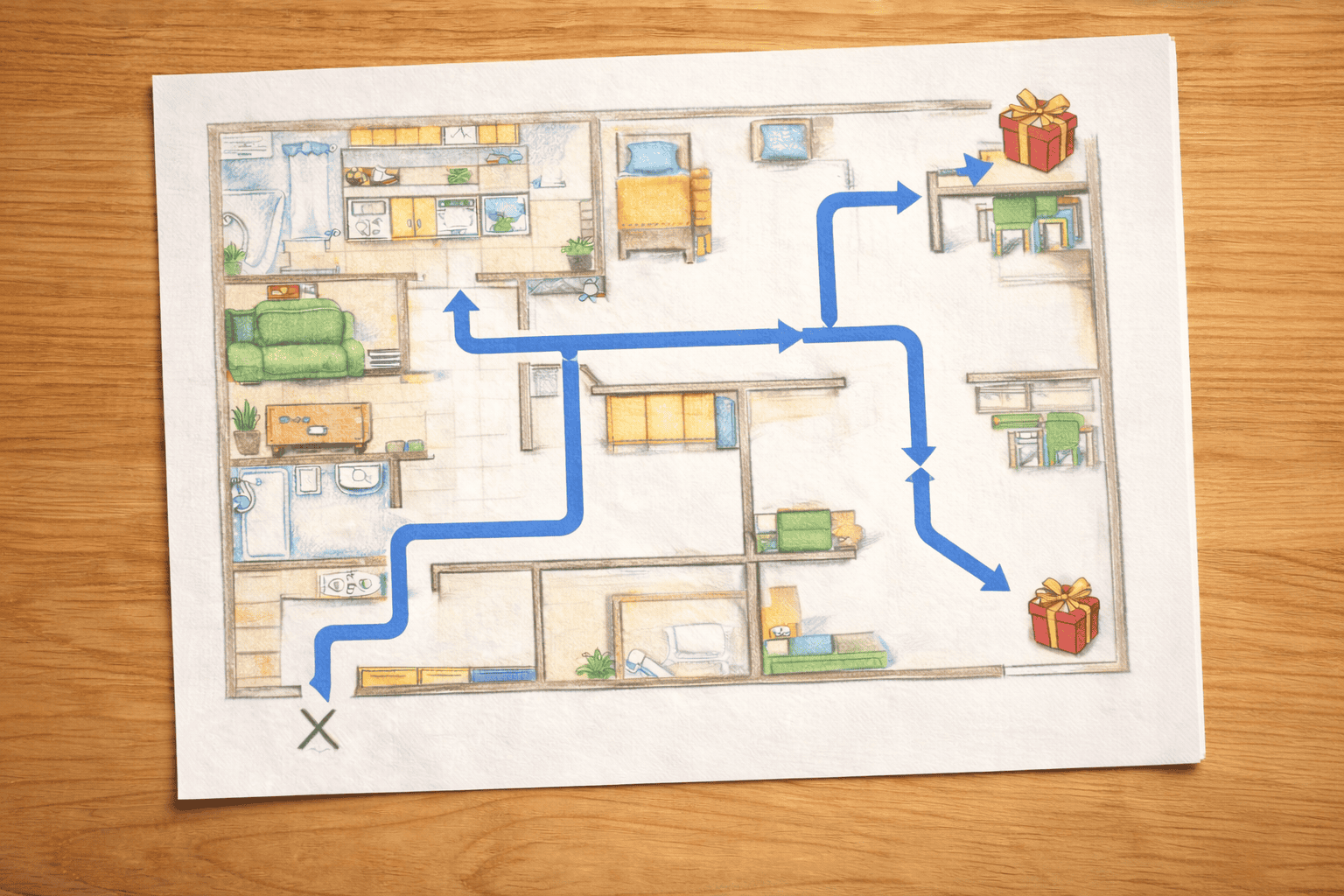 Взрослый даёт маршрут. Инструкция может быть устная :«От двери сделай два шага вперёд, поверни направо и подойди к столу» или в виде карты. Ребёнок выполняет без показа. Усложнение: маршрут из 5–7 команд, смена темпа, выполнение с закрытыми глазами