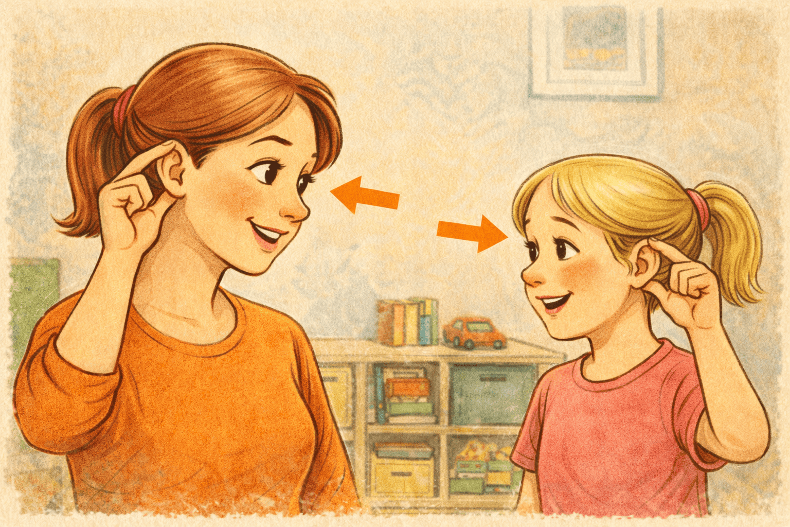 «Покажи у себя правое ухо — теперь у меня», с проговариванием предлогов и направлений.